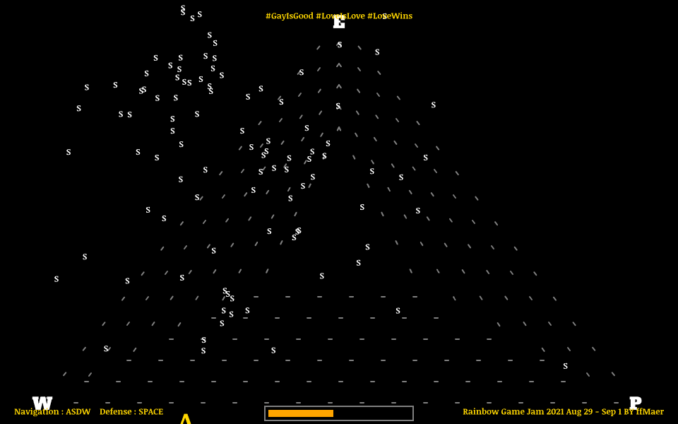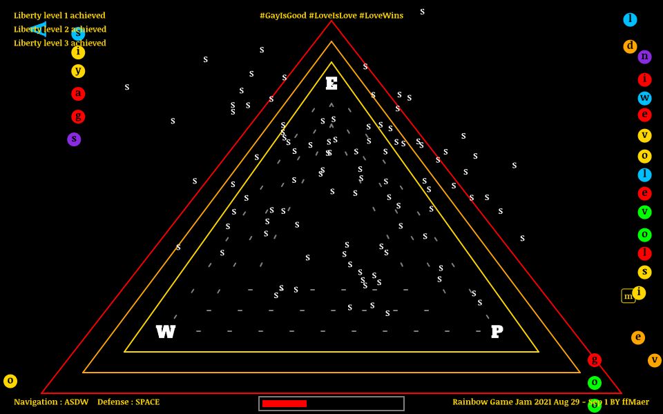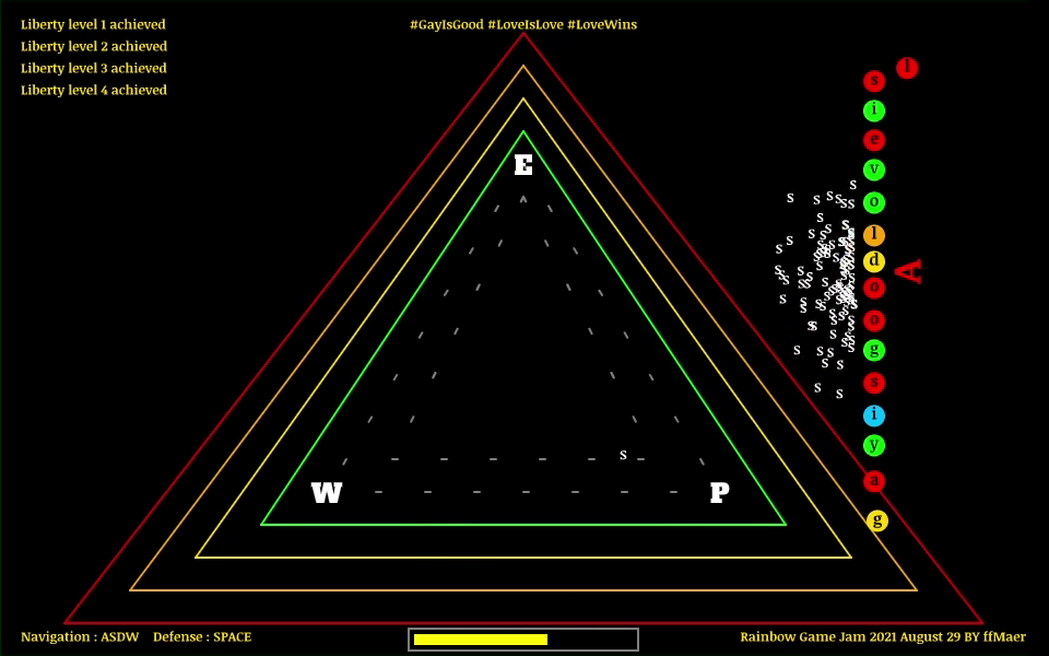 ⚔️ Do you have the courage to counter these negative messages with affirmative statements, such as firmly saying, "gay is good"? [Press the SPACE bar on your keyboard to create a wall that shields you from the structural oppression, represented by the letter "s," which chases and attacks your character.]